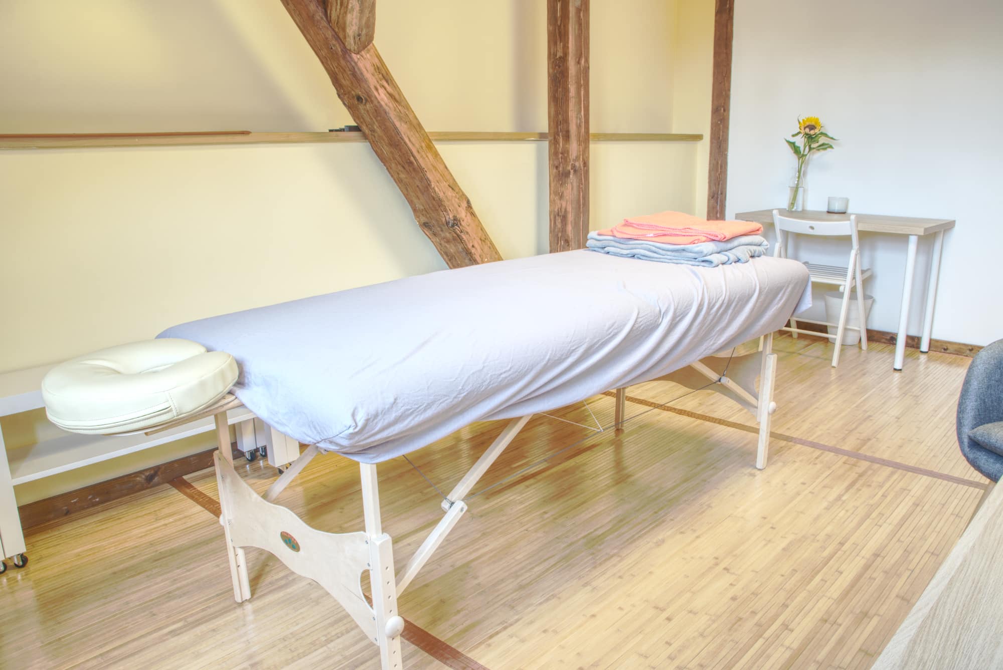 2 křesla a stolek, masážní lehátko, komoda, kancelářský stůl se židlí, bambusový koberec, malé poličky na kolečkách, na odložení deky, ručníků, nástrojů používaných při terapiích